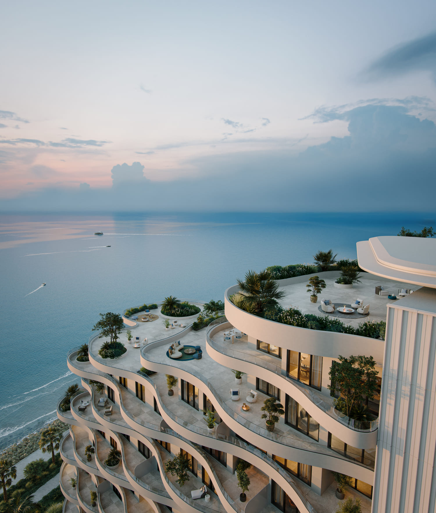 Miraggio is a sculptural architectural masterpiece set on the shores of Al Marjan Island, Ras Al Khaimah. Inspired by the movement of the sea and the tranquility of nature, its cascading terraces and curved façade seamlessly blend with the surrounding landscape. The building invites residents into a space of calm and timeless elegance — where every moment is shaped by the rhythm of the ocean, the warmth of the sun, and the organic flow of design. More than a residence, Miraggio is a sanctuary of art, architecture, and sensory well-being.