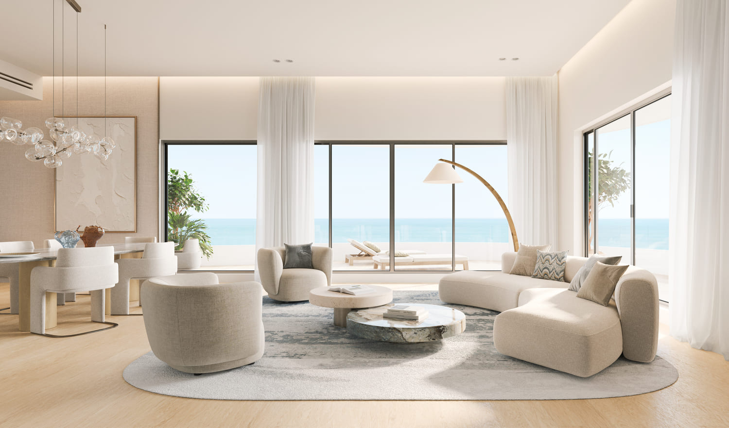 The residences offer expansive layouts with natural stone finishes, panoramic terraces, and floor-to-ceiling windows that flood the interiors with light. Soft neutral tones, high-end materials, and harmonious textures create a sense of openness and refinement throughout. Indoor and outdoor spaces flow into each other, offering uninterrupted views of the Arabian Gulf and inviting serenity into daily living. Every detail is crafted to elevate comfort, beauty, and a deeply personal connection to the coastal environment.