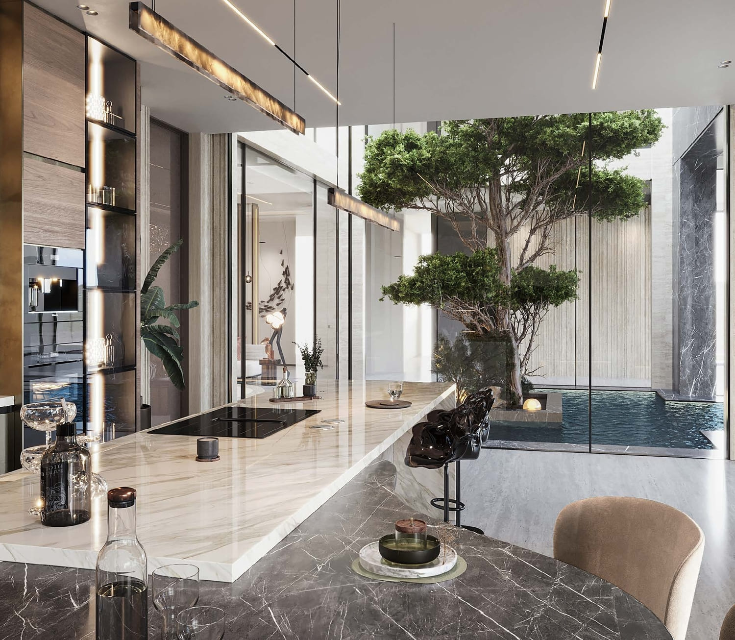 Villa Amaya at Palm Jumeirah is a sensorial oasis that encapsulates a luxurious blend of materials sourced from around the world. From the dramatic Marquina marble of the Basque country to the pure Calacatta from Tuscany, and the enigmatic Emperador marble from southeast Spain, every detail is meticulously curated. The infusion of natural wood and gleaming bronze, coupled with rich leathers, fabric, and flourishing foliage, creates a harmonious composition that engages the senses, making Villa Amaya a haven of sophistication from the outside in.